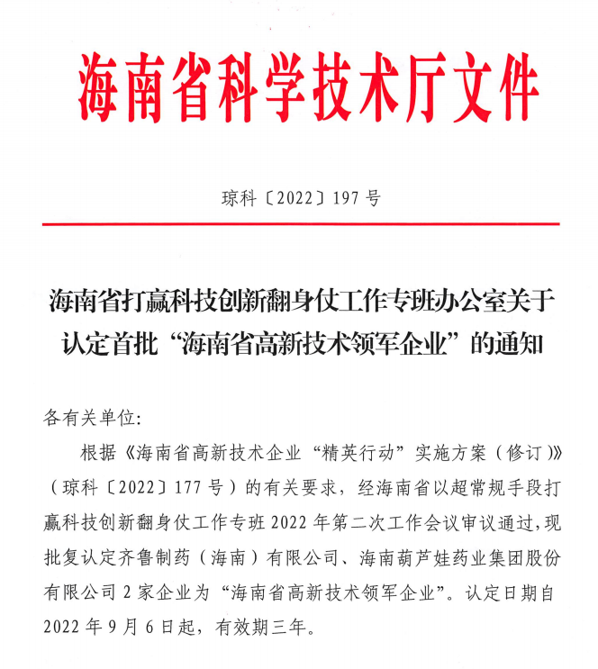 近日,海南省科学技术厅发布的《海南省打赢科技创新翻身仗工作专班办公室关于认定首批“海南省高新技术领军企业”的通知》中显示,批复认定海南z6尊龙药业集团股份有限公司等2家企业为“海南省高新技术领军企业”。认定日期自2022年9月6日起,有效期三年。